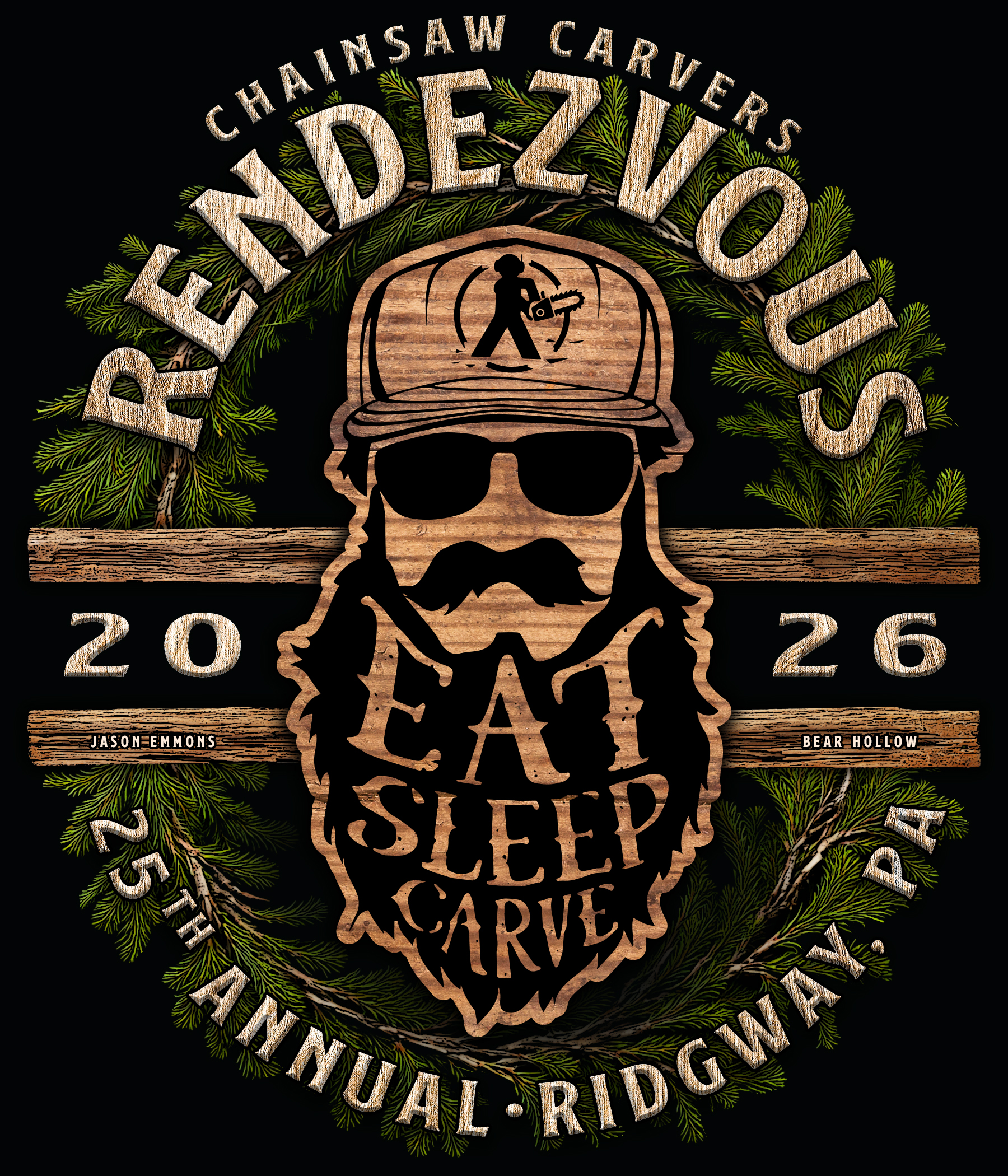 Official t-shirt of the 2026 Chainsaw Carvers Rendezvous. Artwork inspired by carver Jason Emmons.
